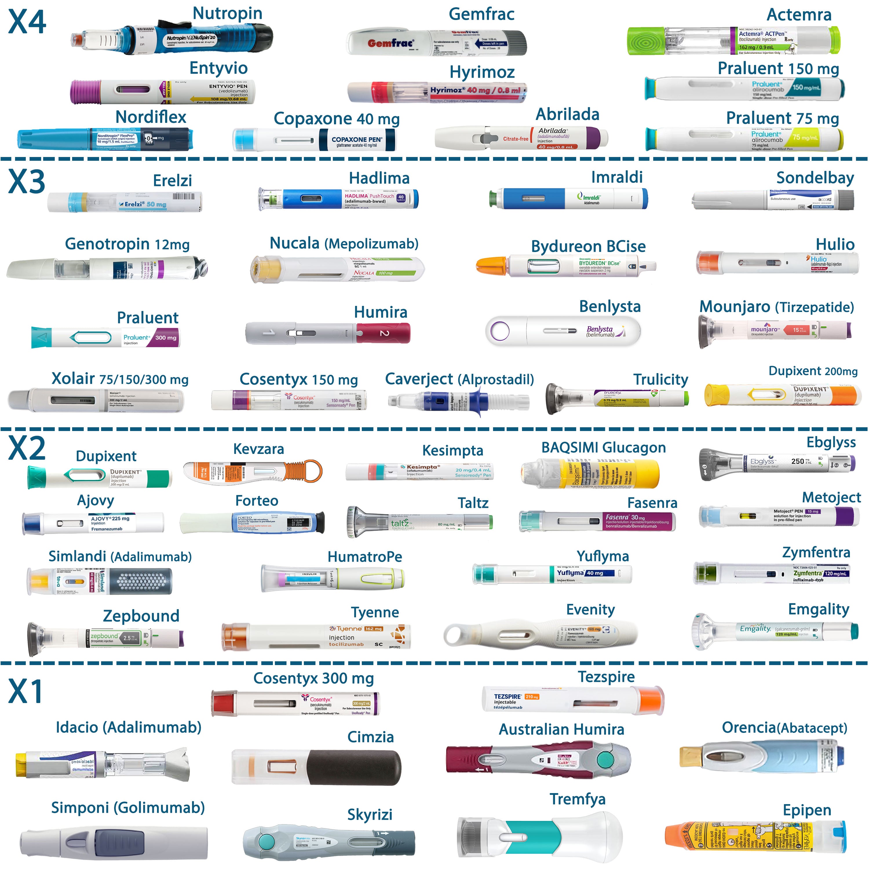 Parliamo, ad esempio, di trattamenti per le allergie come l’EpiPen, iniezioni per l’artrite reumatoide come Humira o Enbrel, farmaci contro l’emicrania come Aimovig o Emgality, colliri sensibili alla temperatura, iniezioni per la sclerosi multipla, terapie sostitutive del testosterone, trattamenti per la disfunzione erettile come il Trimix, farmaci per l’osteoporosi come Prolia, Xgeva o Forteo, trattamenti per il colesterolo come Repatha e Praluent, oltre a vaccini, Botox e terapie per l’eczema come Dupixent.